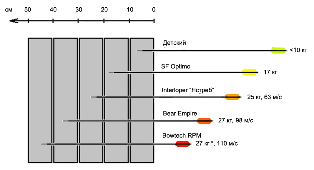 | Класс лука | Сила натяжения (кг), выходная скорость (м/с) | Толщина щита, см |