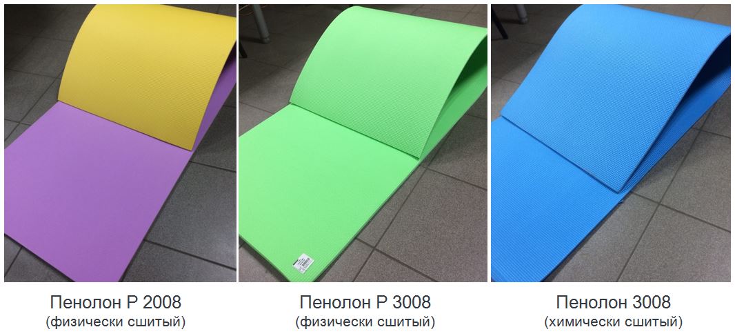 Коврики изготавливаются из химически сшитого пенополиэтилена (Пенолон) или физически сшитого пенополиэтилена (Пенолон-Р).
